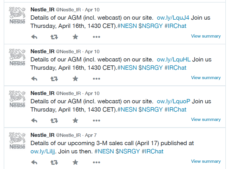 A quick review of @Nestle_IR content today (8/5/15) shows a total of 629 “Tweets” since the start of the account in 2011, with many of the Tweets appearing with identical wording 3-4 times in the same day (but not thereafter), along with little effort to optimize their content for new eyeballs.  In all, the Nestle_IR Twitter effort seems largely a corporate speak monologue and virtually no character or listening or acknowledgement of others. We found just one retweet in the past year; ironically for an IR Magazine post.